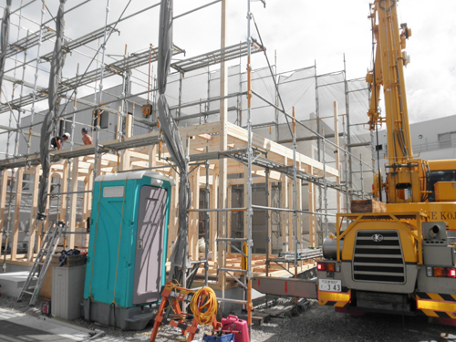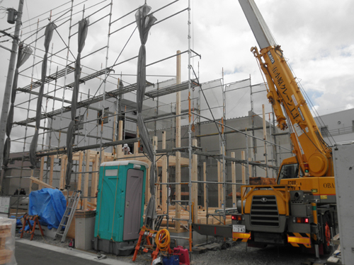 <クレーン車で重い柱や梁が次々と上げられます>