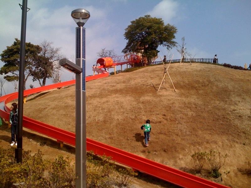 左手に見えてくる小高い丘からのびる滑り台。