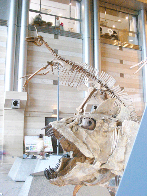 入り口を入ると、巨大魚とチンタオサウルスの化石が出迎えてくれます。