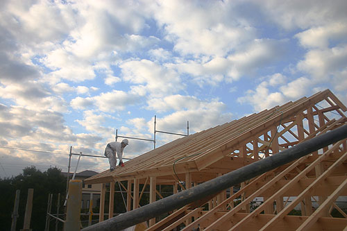 現場に着くと大工さんがちょうど屋根の野地板を貼り付けているところでした。
