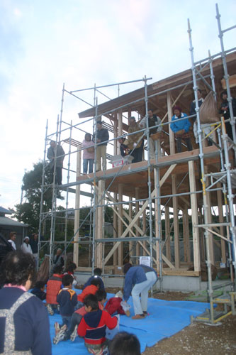 そして近所の皆さんや子供のお友達など大勢が集まって祝福する昔ながらの上棟式。