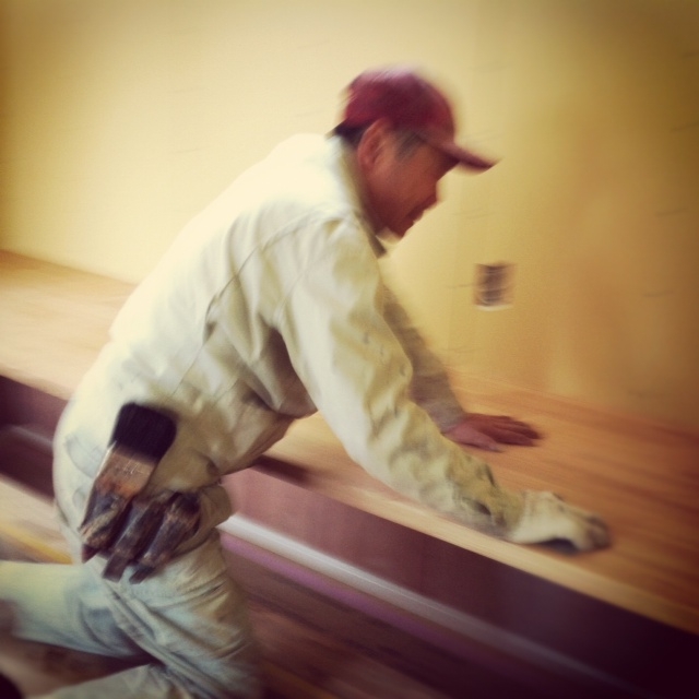 サンドペーパーをクリア塗装した建具にかけているところでした。