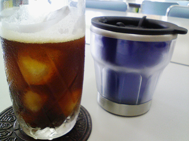 同じタイミングで入れたアイスコーヒーですが、3分ほど経つと普通のグラスは