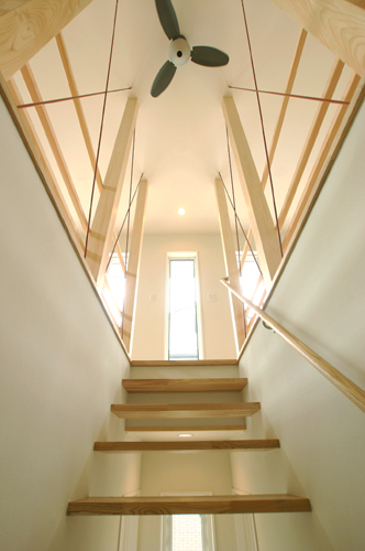 2階リビングを左右対称に捉えた横アングルの奥行きのある写真。