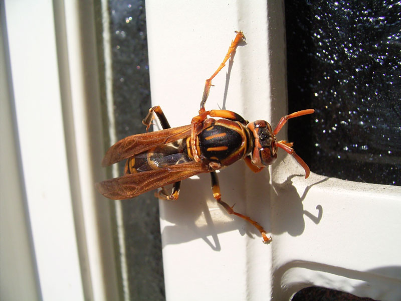 その屋根に巣造り真っ最中のアシナガ蜂でした。