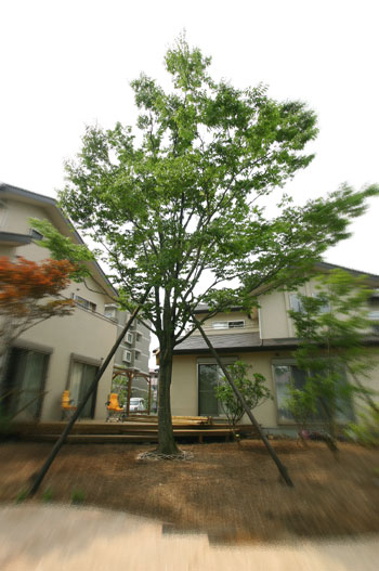 庭の中心に植えたケヤキが堂々と枝を広げていました。
