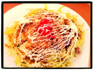 広島風の麺の入ったお好み焼きは外側はパリッと香ばしく