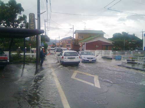 冠水して通れなくなった道路に立ち往生する車を出さない為に